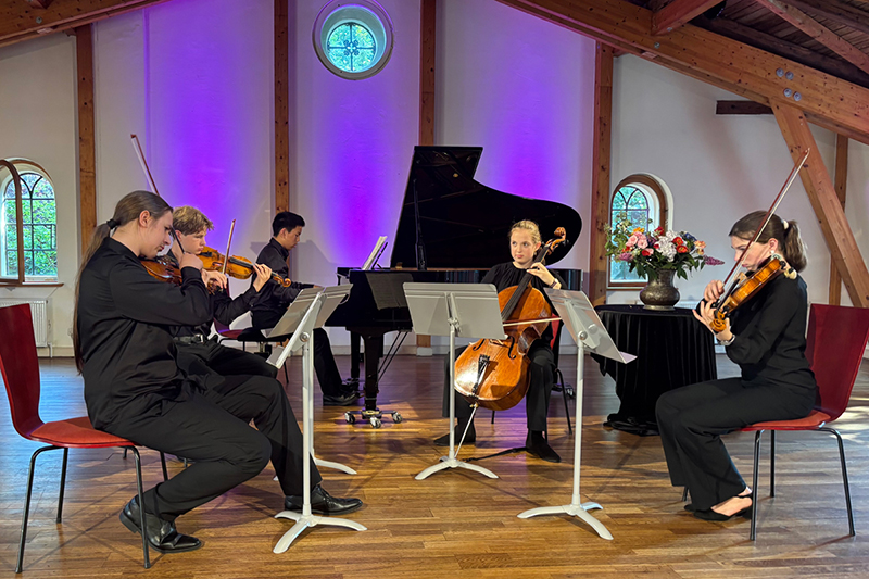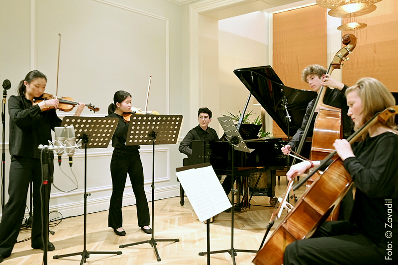 Das „Merkur Klavierquintett“ der IJK, Hamburg mit Sijia Liu, Violine, Yaeko Gamo, Viola, Martin Bruderreck, Klavier, Jonathan Fetting, Kontrabass und Maya Tjærby Korneliusen, Violoncello in der Tesdorpfstraße 13 am 14.02.2025.